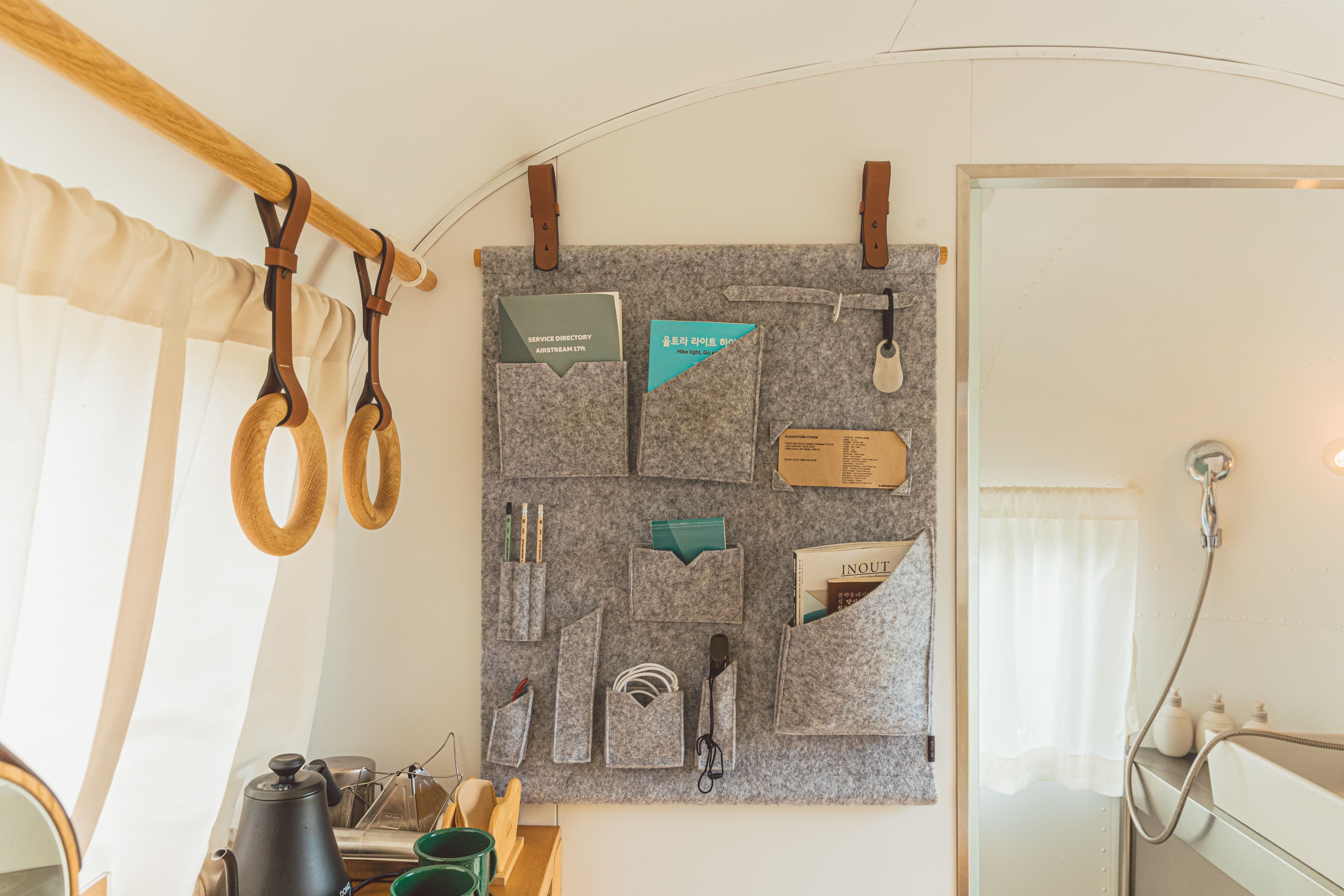 The DISPLAY WALL is equipped with various items and camping-related books for enjoying the AIRSTREAM.